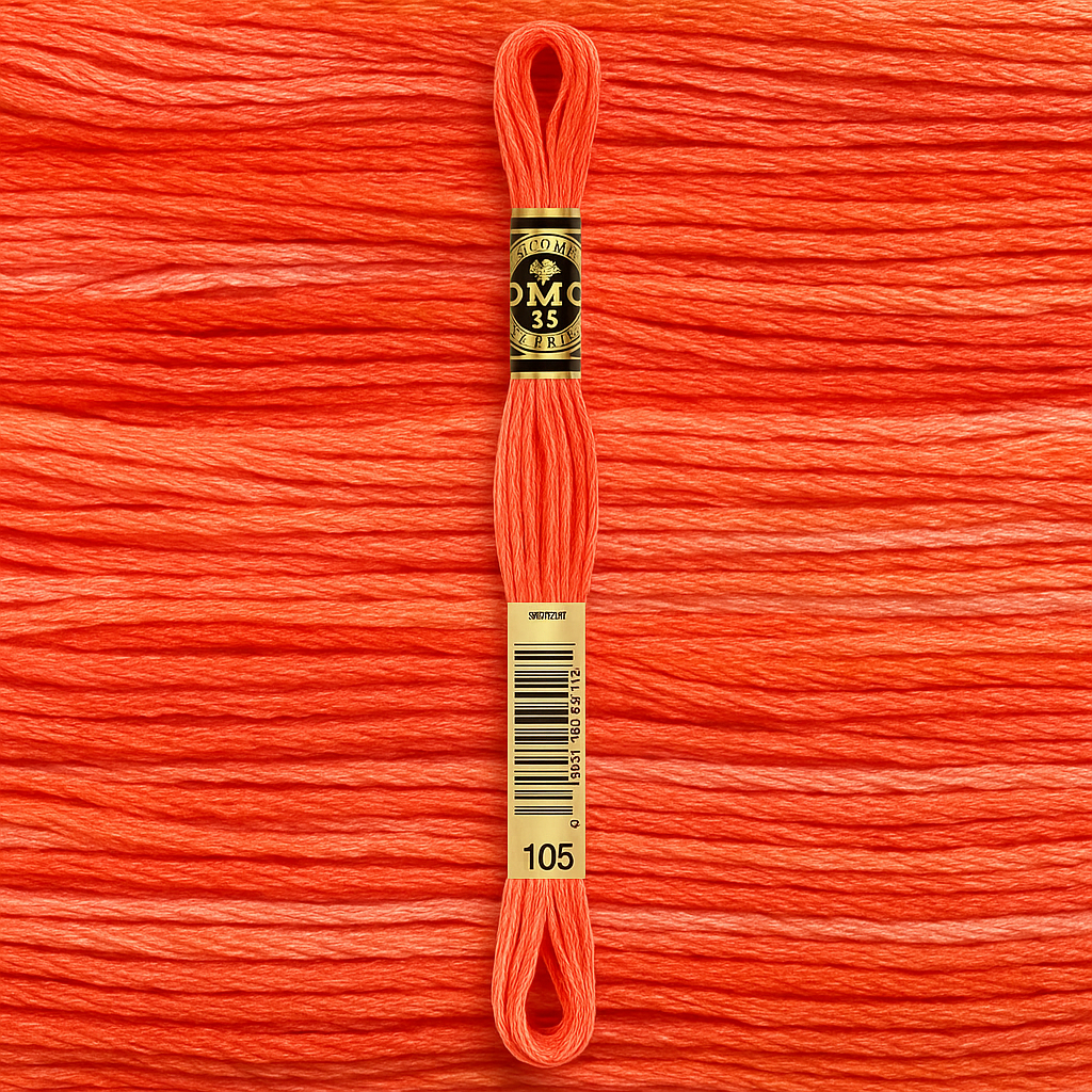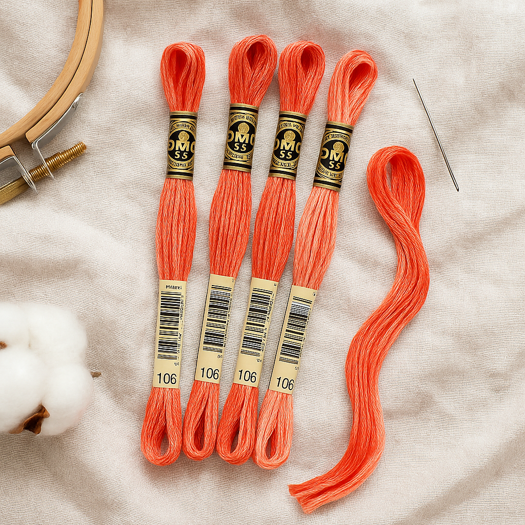 DMC Mouline №106 — меланжевый коралловый оттенок с плавными переходами от насыщенного оранжево-красного к нежному розовому. Нить придаёт вышивке эффект живого сияния и идеально подходит для цветочных узоров, морских мотивов, летних орнаментов и акцентных деталей.