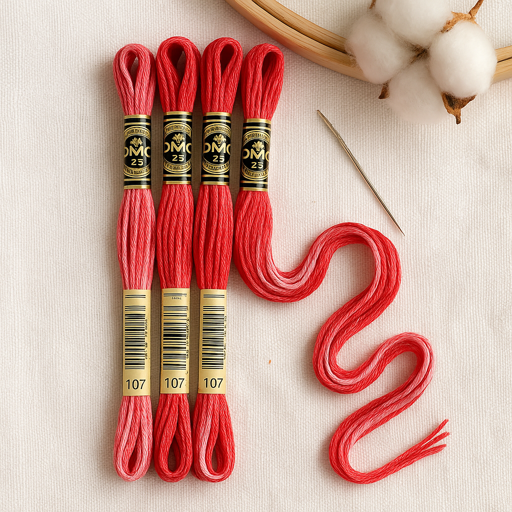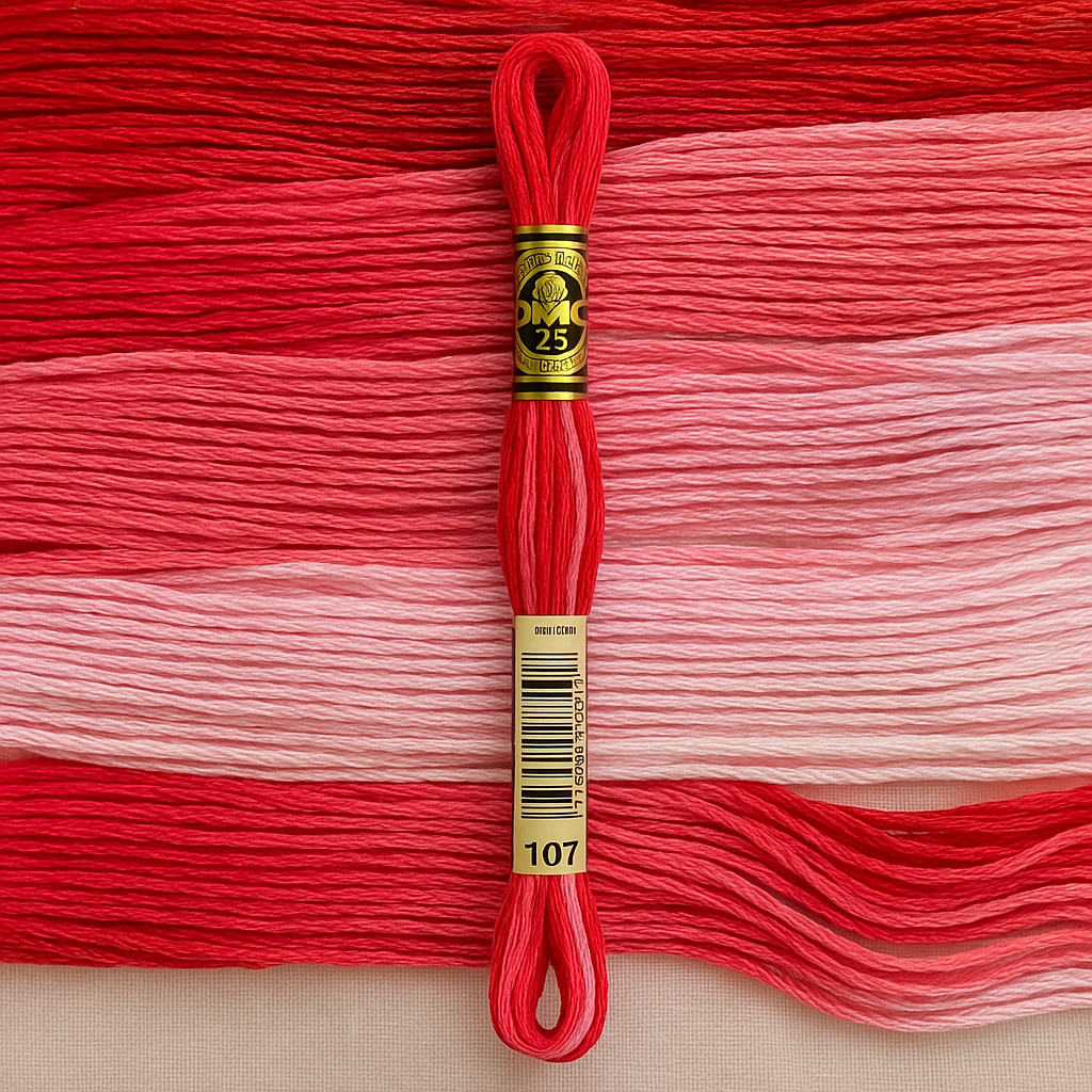 DMC Mouline №107 — меланжевый розово-красный оттенок с плавными переходами от яркого карминного до светлого розового. Этот сочный цвет идеально подойдёт для вышивки цветочных узоров, романтичных орнаментов, сердечек и декоративных элементов с игривым акцентом.