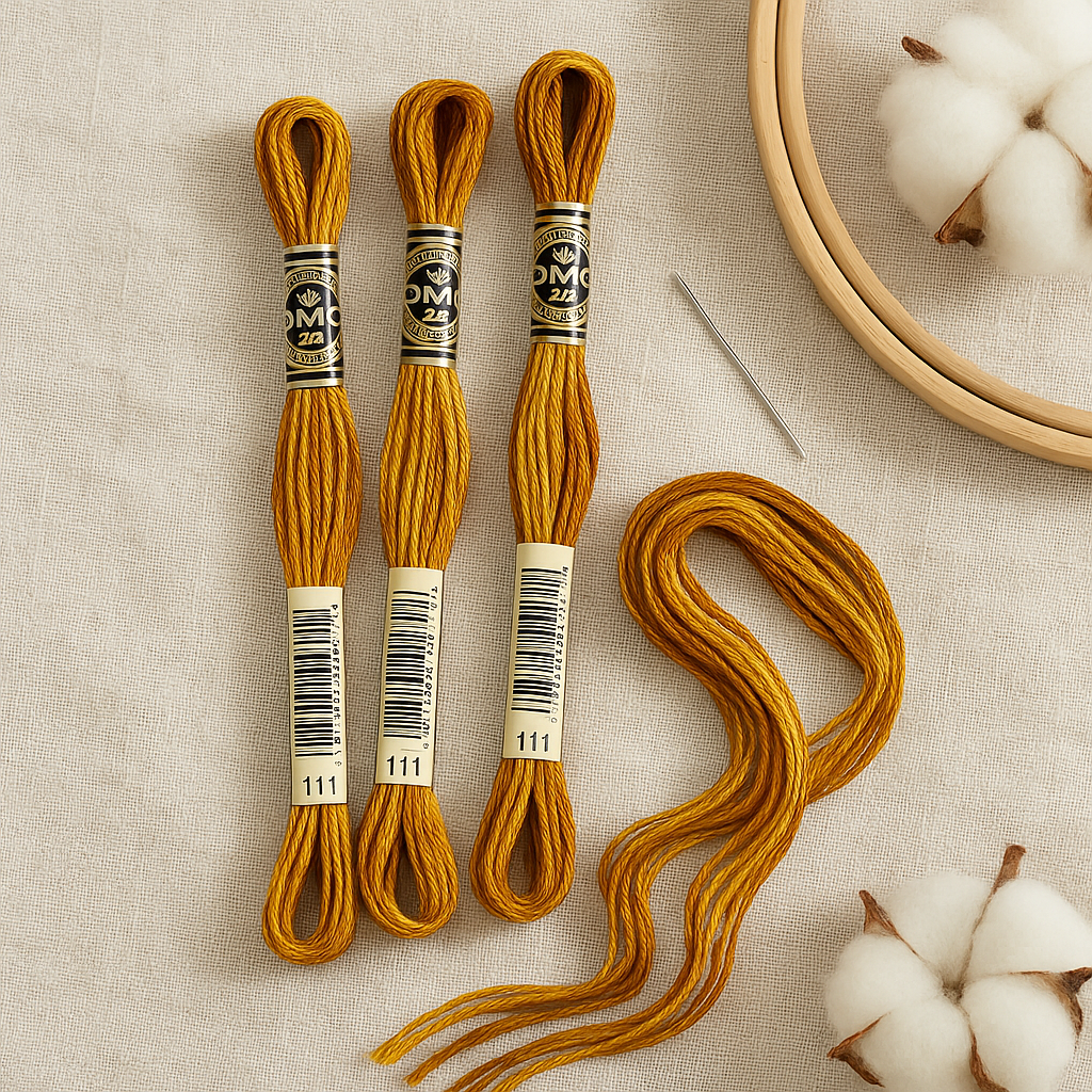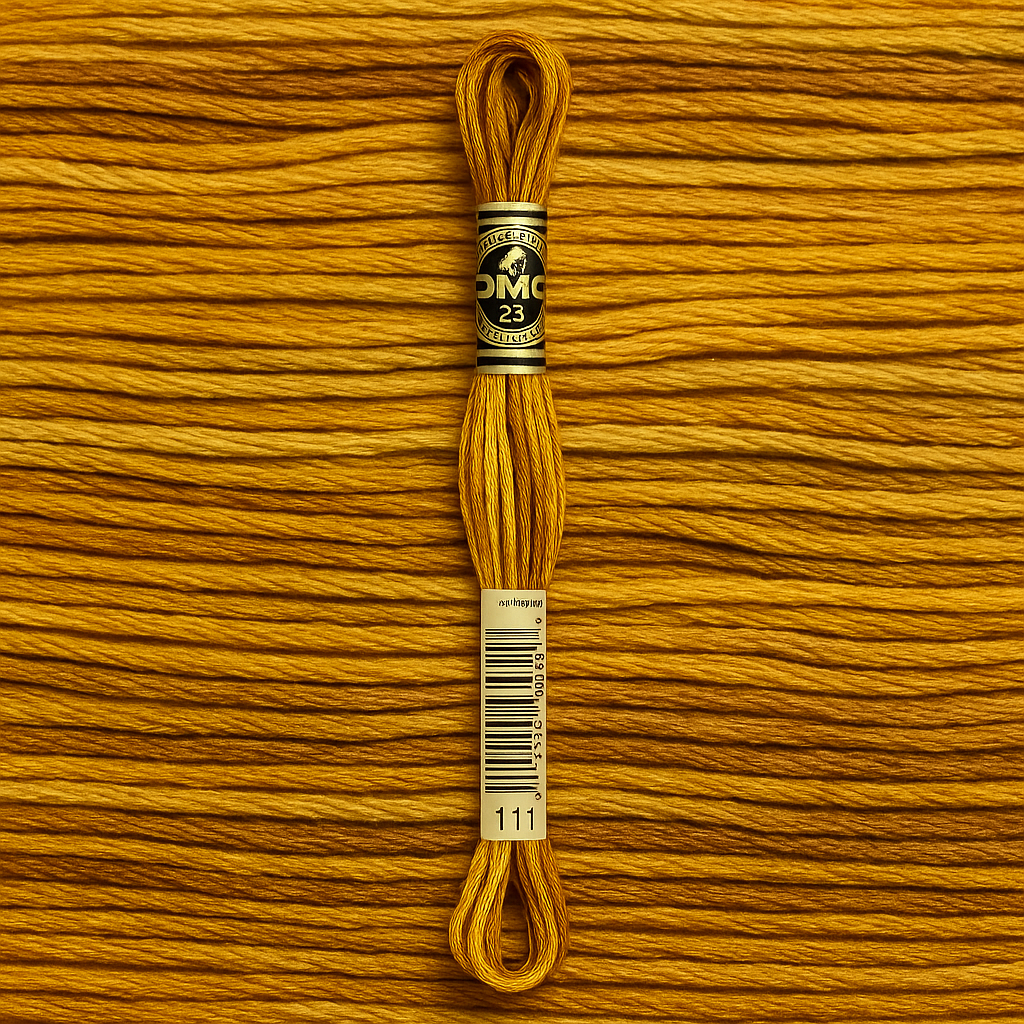 DMC Mouline №111 — меланжевый золотисто-коричневый оттенок с плавными переходами от светлого янтаря до насыщенного охристого. Этот тёплый цвет идеально подойдёт для осенних узоров, этнических орнаментов, флористики и декоративных элементов с эффектом глубины.