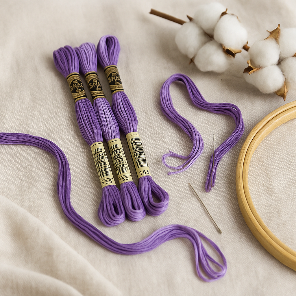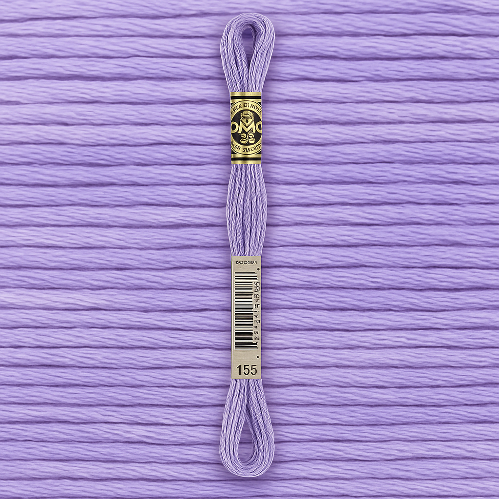 Мулине DMC оттенка 155 — это нежный лавандовый цвет с мягким холодным подтоном. Он идеально подходит для вышивки цветов, узоров в пастельной гамме, романтичных композиций и декоративных деталей. Оттенок создаёт ощущение лёгкости, свежести и изысканности.