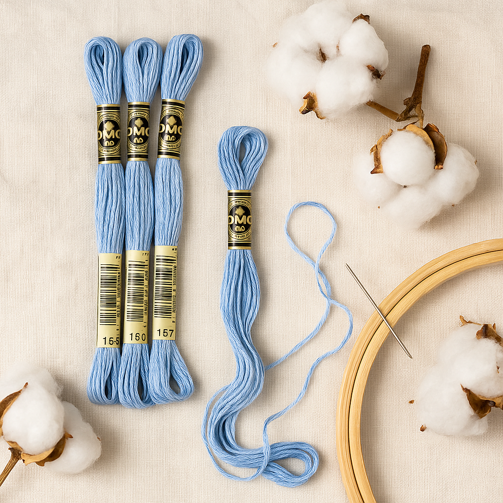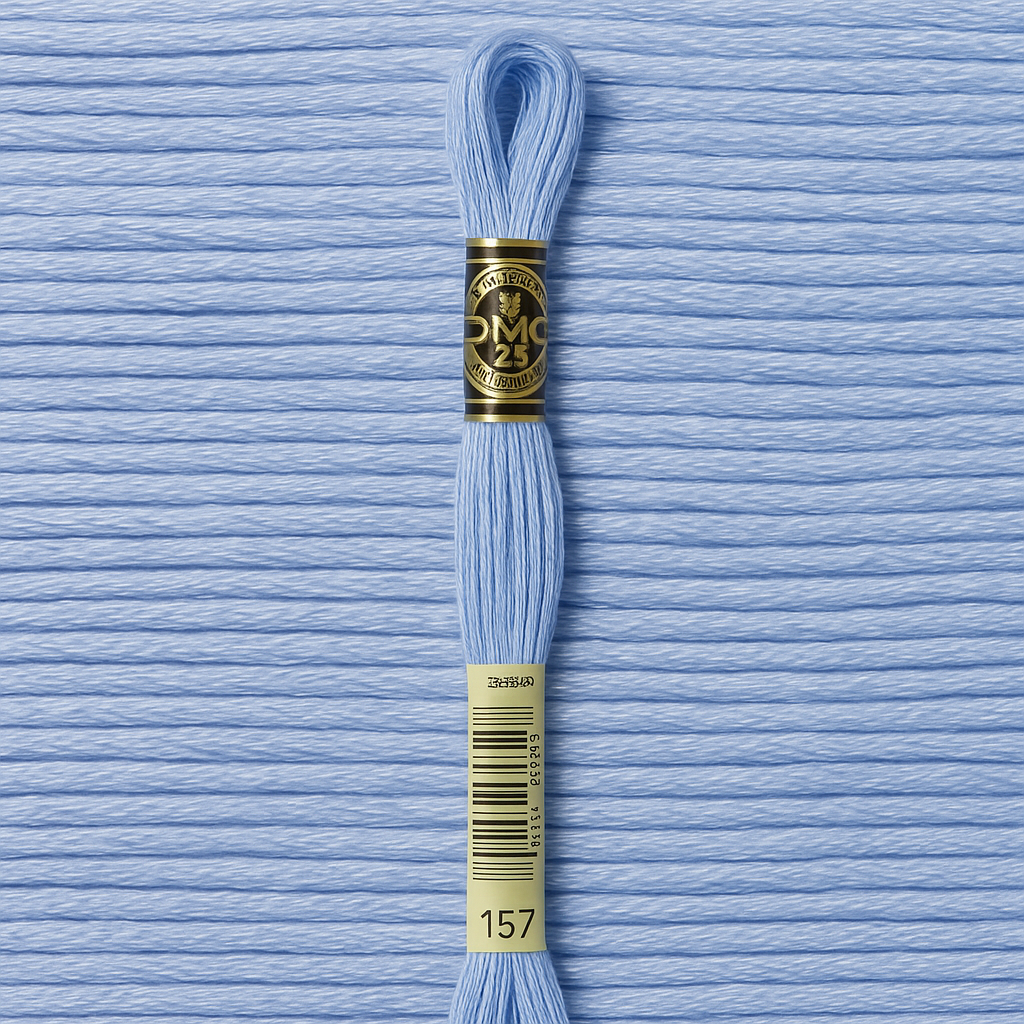 Мулине DMC оттенка 157 — это нежный голубой с лёгким лавандовым подтоном. Оттенок напоминает утреннее небо и идеально подходит для вышивки детских изделий, цветочных узоров, пейзажей и лёгких декоративных элементов. Он добавляет в работу мягкость, воздушность и свежесть.