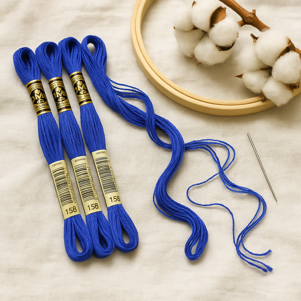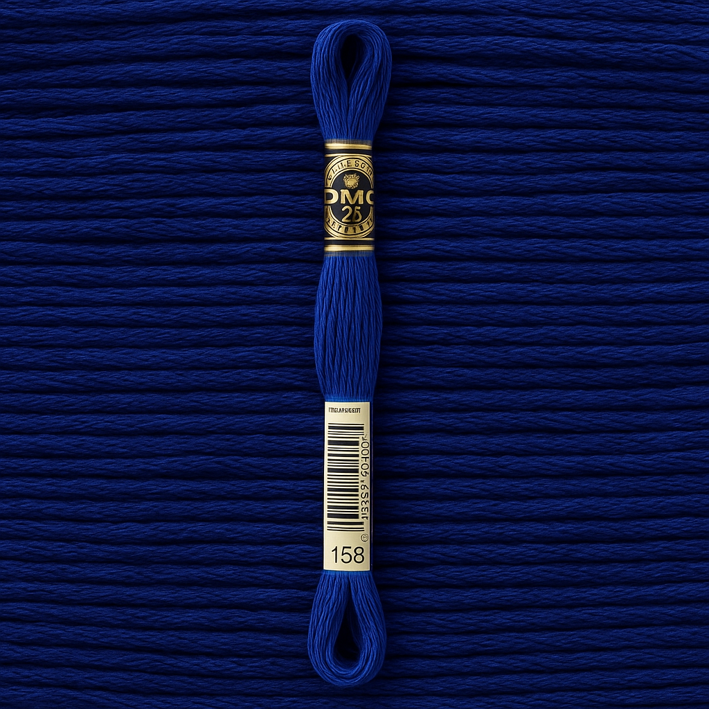 DMC Mouline Spécial 25, цвет 158 — насыщенный васильково-синий. Глубокий, выразительный оттенок синего идеально подходит для вышивки пейзажей, морских мотивов и контрастных акцентов в орнаментах. Нить мягко скручена из 6 легко разделяемых прядей, что позволяет регулировать толщину стежка.