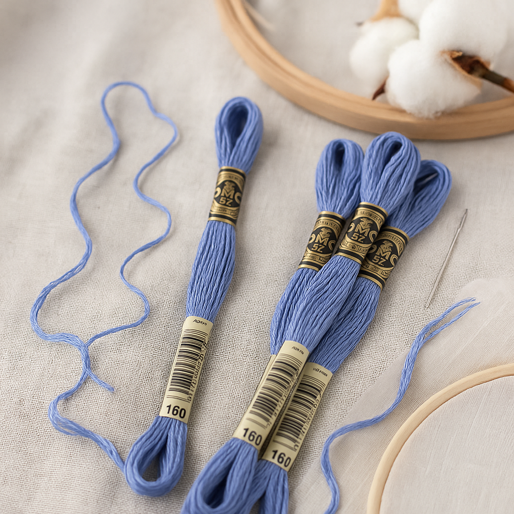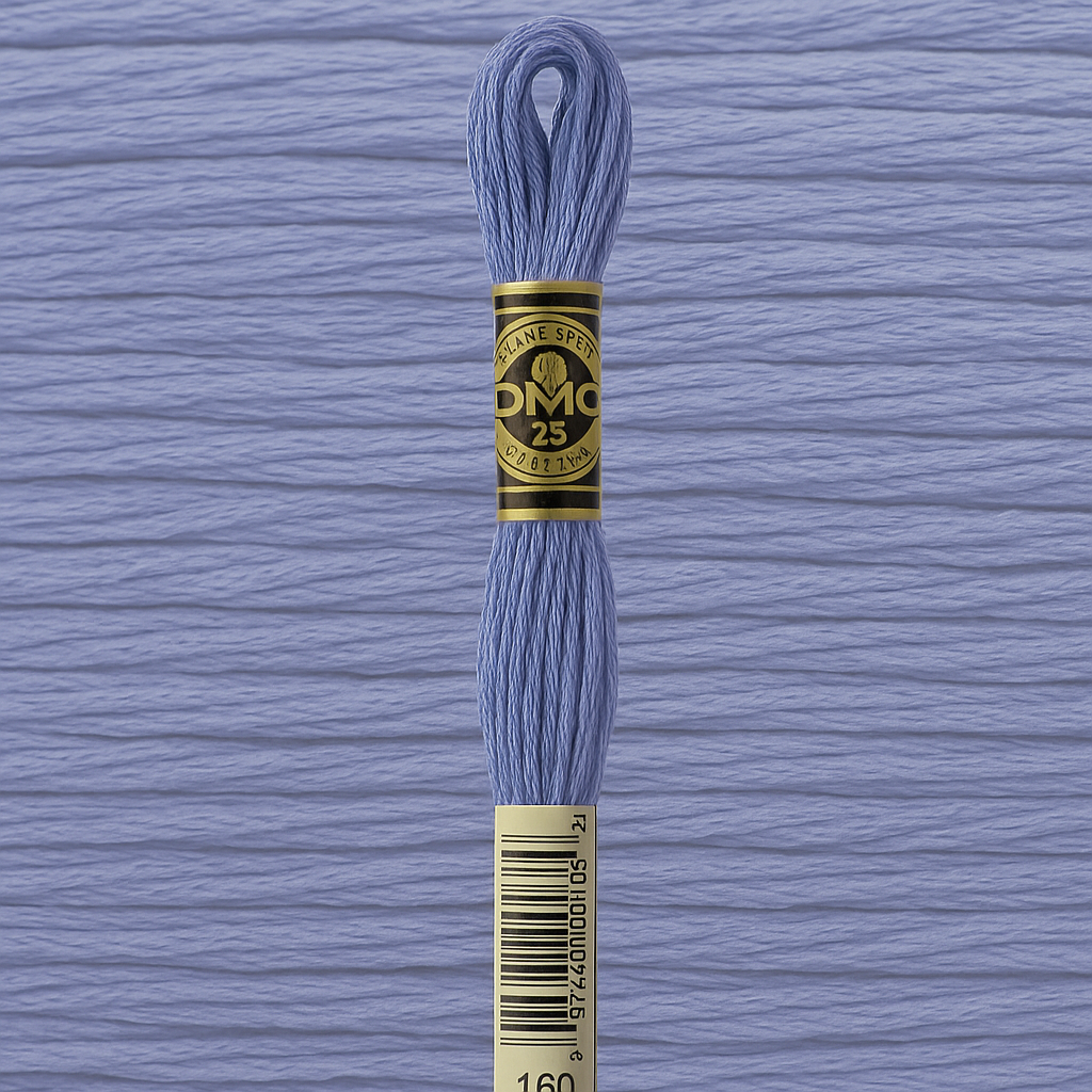 DMC Mouline №160 — это нежный средне-голубой оттенок с лёгким серо-лавандовым подтоном. Он прекрасно подходит для создания воздушных переходов в вышивке, изображения неба, воды и цветочных мотивов. Благодаря мягкой глубине цвета №160 гармонично сочетается как с пастельной гаммой, так и с более насыщенными синими или фиолетовыми тонами.