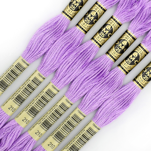 DMC № 210 — это очень светлый пастельный фиолетовый оттенок, напоминающий нежные лепестки сирени. Он идеально подходит для вышивки романтичных узоров, цветочных мотивов, детских дизайнов и лёгких фоновых элементов. Благодаря своей мягкости и деликатности, цвет 210 часто используется в плавных переходах вместе с более насыщенными фиолетовыми тонами (208, 209), создавая гармоничную градацию.