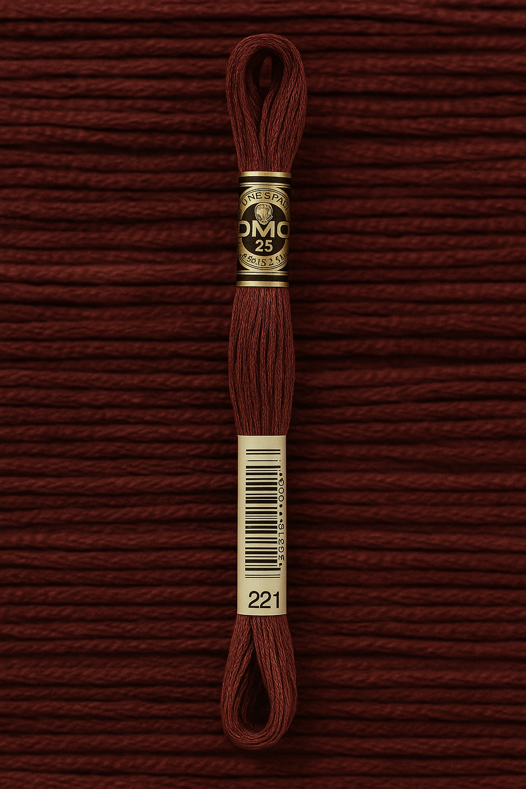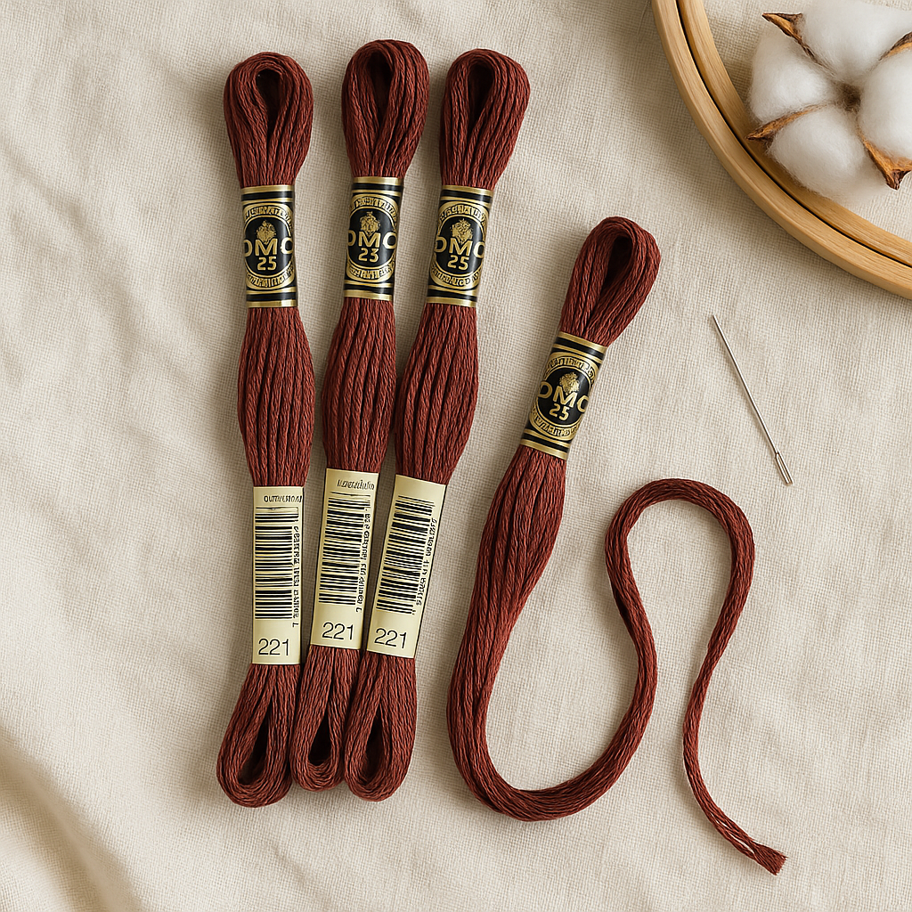 DMC Mouline №221 — глубокий винно-коричневый оттенок с лёгким бордовым отливом. Этот благородный цвет прекрасно подходит для вышивки осенних мотивов, этнических орнаментов, портретов и декоративных элементов, где важны тепло и насыщенность тона.