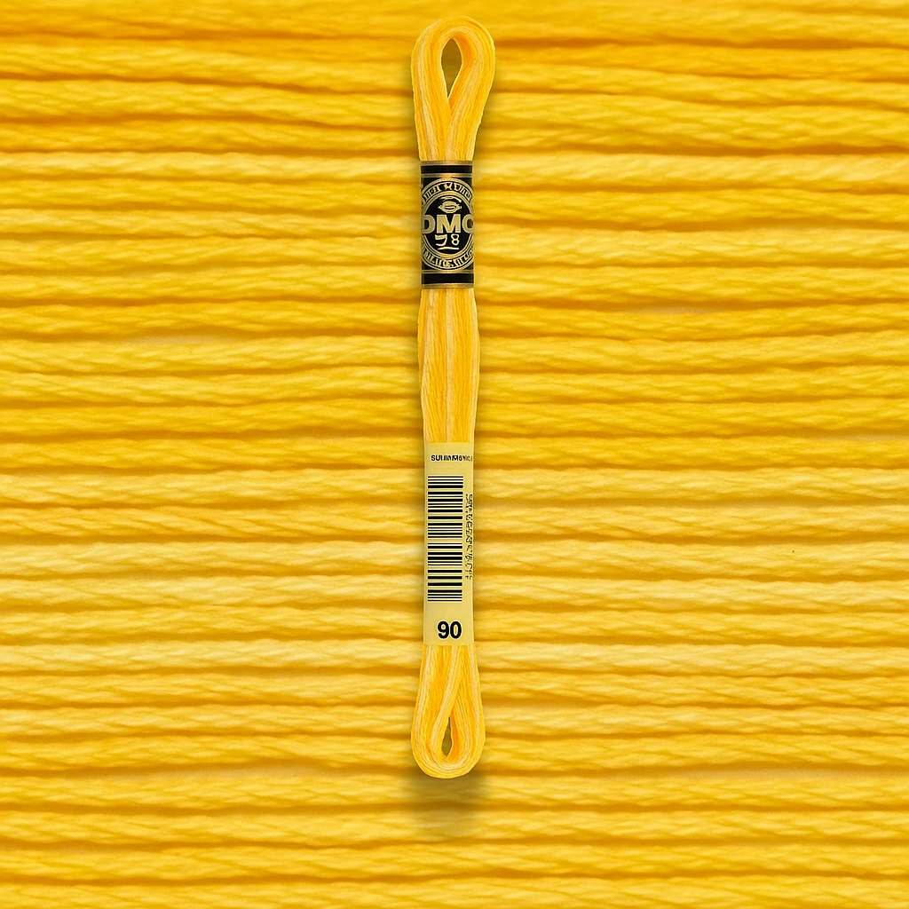 DMC Mouline №90 — меланжевый солнечный оттенок с плавными переходами от светло-жёлтого до золотисто-оранжевого. Нить создаёт эффект живого сияния и идеально подходит для вышивки цветов, орнаментов, детских мотивов и акцентов с тёплым настроением.