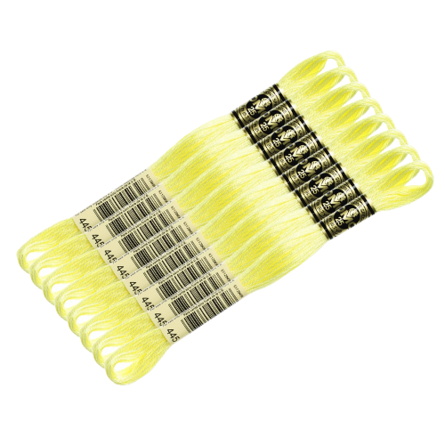 Классическое мулине D.M.C. в нежном светлом оттенке. Цвет №445 — это мягкий пастельно-жёлтый тон, идеально подходящий для детских дизайнов, цветочных мотивов, нежных градиентов и световых акцентов.