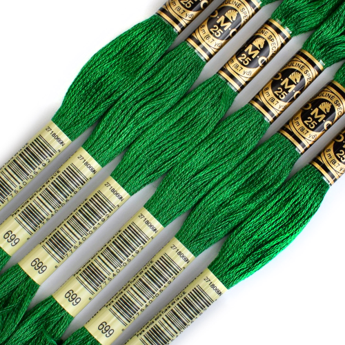 Премиальная нить мулине D.M.C. в чистом и насыщенном зелёном оттенке. Цвет №699 — это классический яркий зелёный тон, идеально подходящий для листьев, растений, природных мотивов, праздничных дизайнов и ярких акцентов.