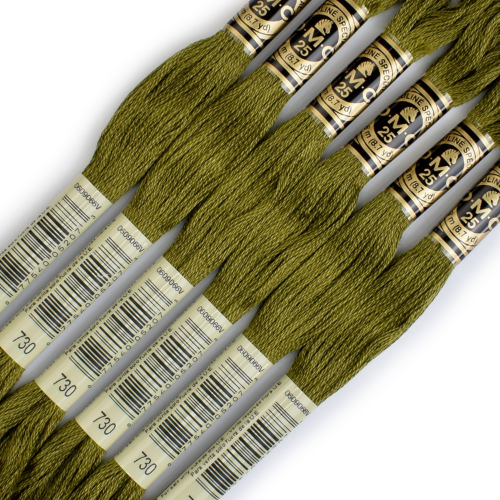 Премиальная нить мулине D.M.C. в глубокoм природном тоне. Цвет №730 — это тёмный оливково-зелёный оттенок, идеально подходящий для ботанических мотивов, листвы, природных дизайнов и проработки теней.
