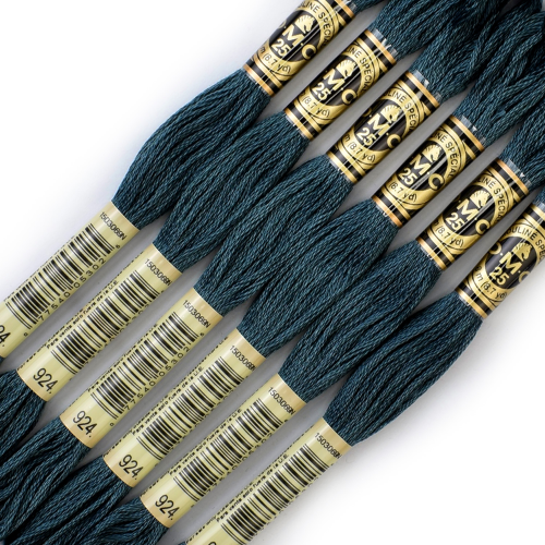 Премиальная нить мулине D.M.C. в глубокoм элегантном оттенке. Цвет №924 — это тёмный серо-сине-зелёный (глубокий тёмный нефрит), идеально подходящий для ботаники, геометрических узоров, мужских дизайнов, теней и утончённых акцентных деталей.