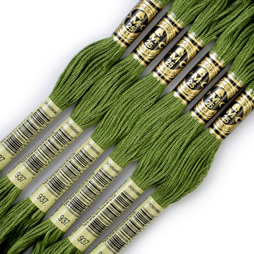 Классическая нить мулине D.M.C. в насыщенном природном оттенке. Цвет №937 — это тёмный травянисто-зелёный тон, идеально подходящий для листьев, стеблей, ботаники, природных мотивов, пейзажей и проработки теней в зелёной палитре.