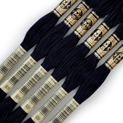 Премиальная нить мулине D.M.C. в самом тёмном синем оттенке палитры. Цвет №939 — это почти чёрный тёмно-синий, идеальный для глубоких теней, контуров, ночных мотивов, геометрических узоров и аккуратной проработки деталей.